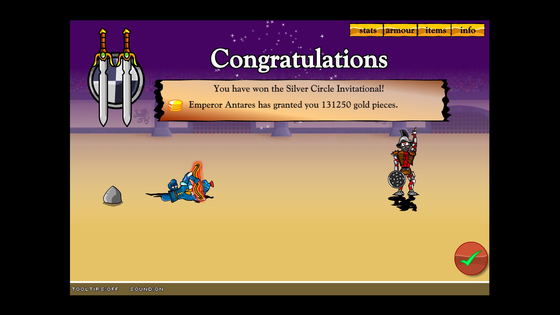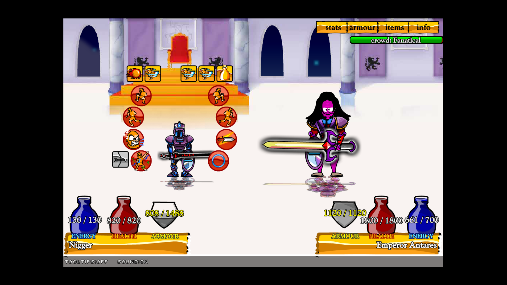 "Gladiator, gladiator, gladiator, Swords and Sandals, Gladiatorrrrr!" You grew up playing the legendary Swords and Sandals turn based combat game series. These games have been played over half a billion times. Swords and Sandals is nostalgia, Swords and Sandals is life.
