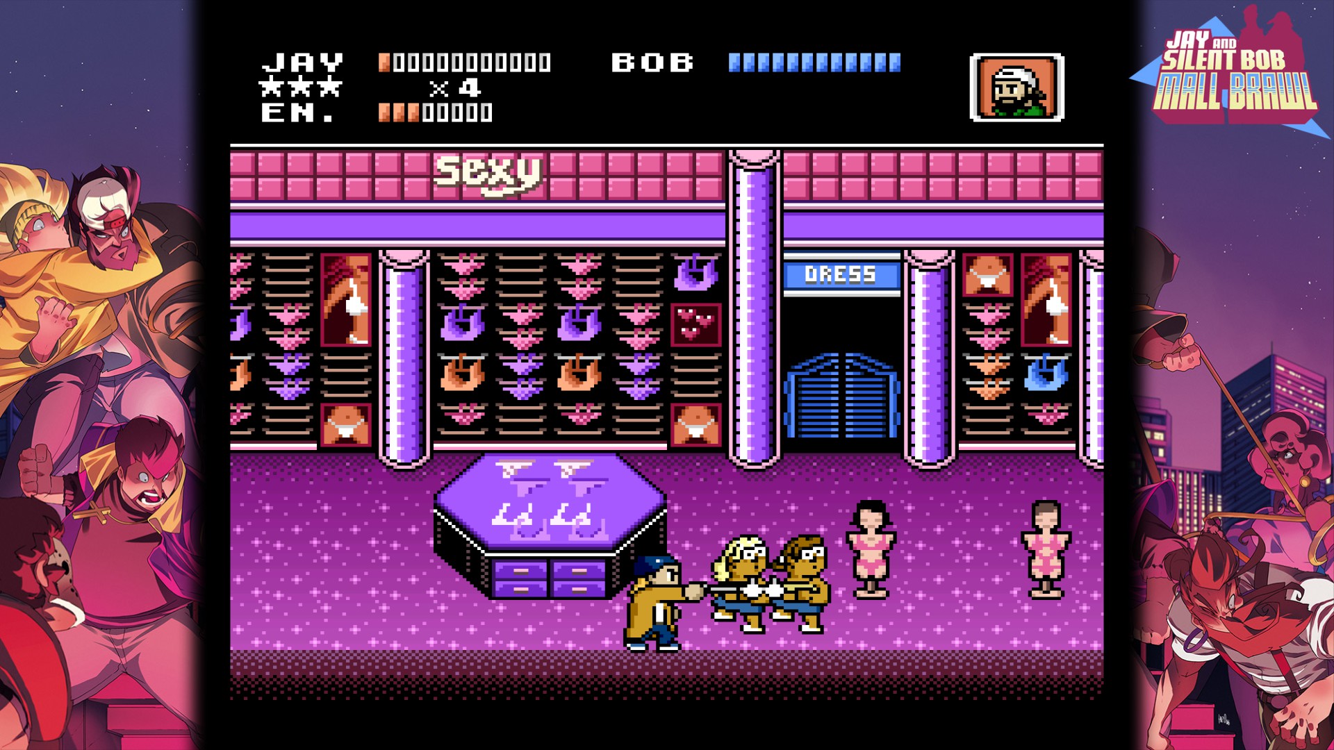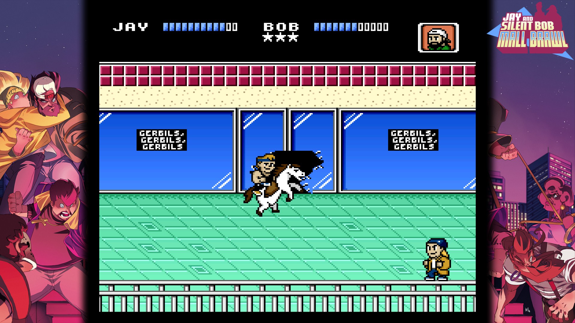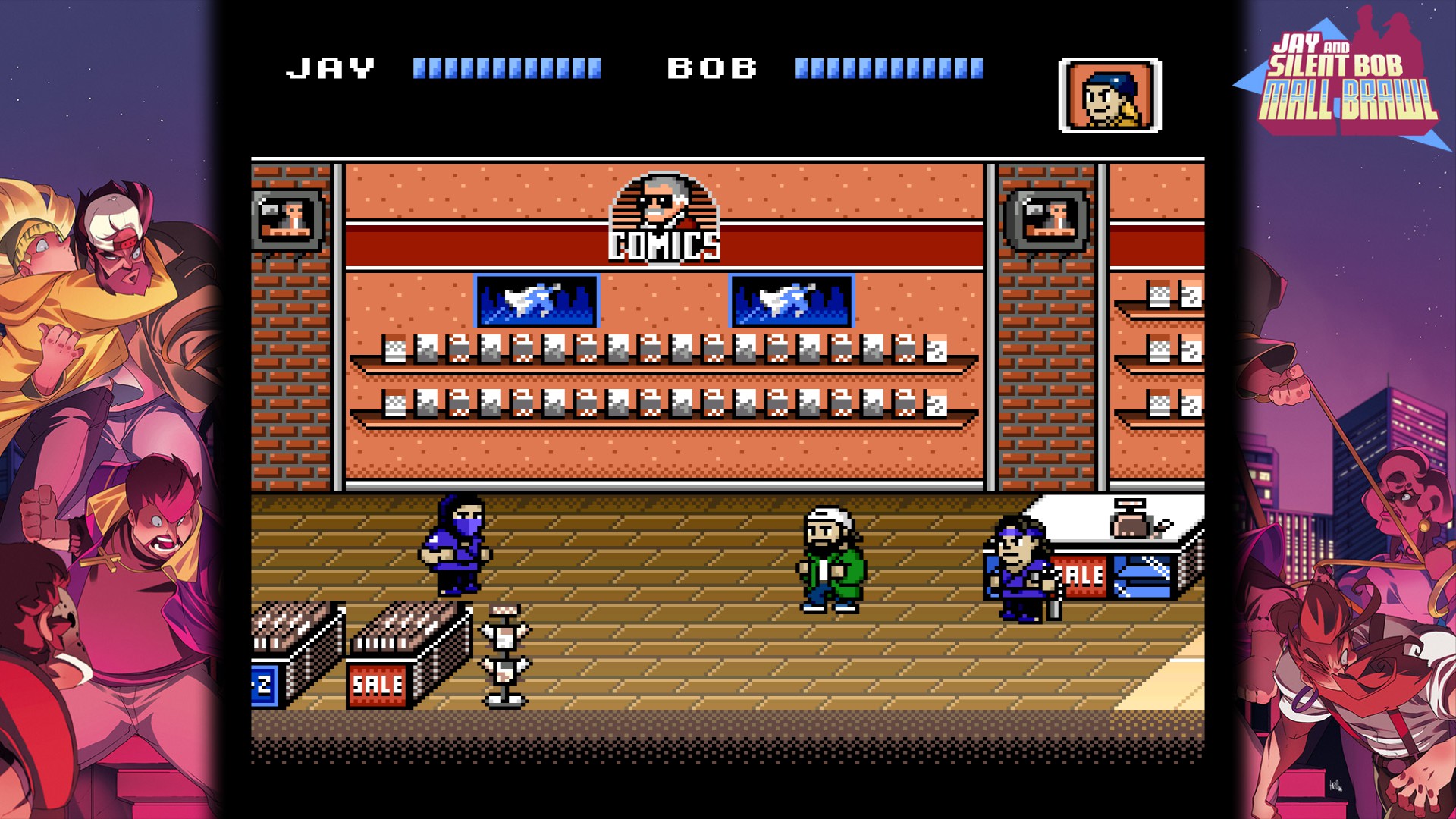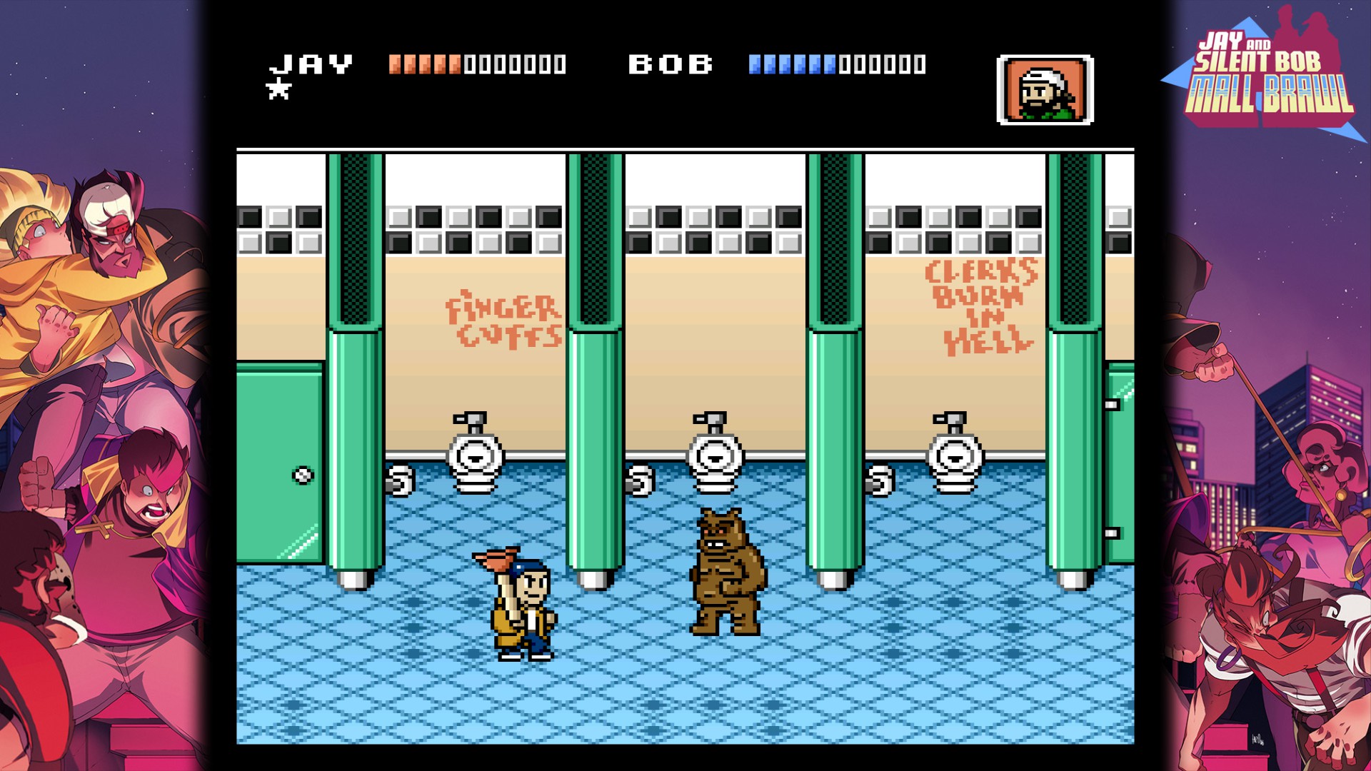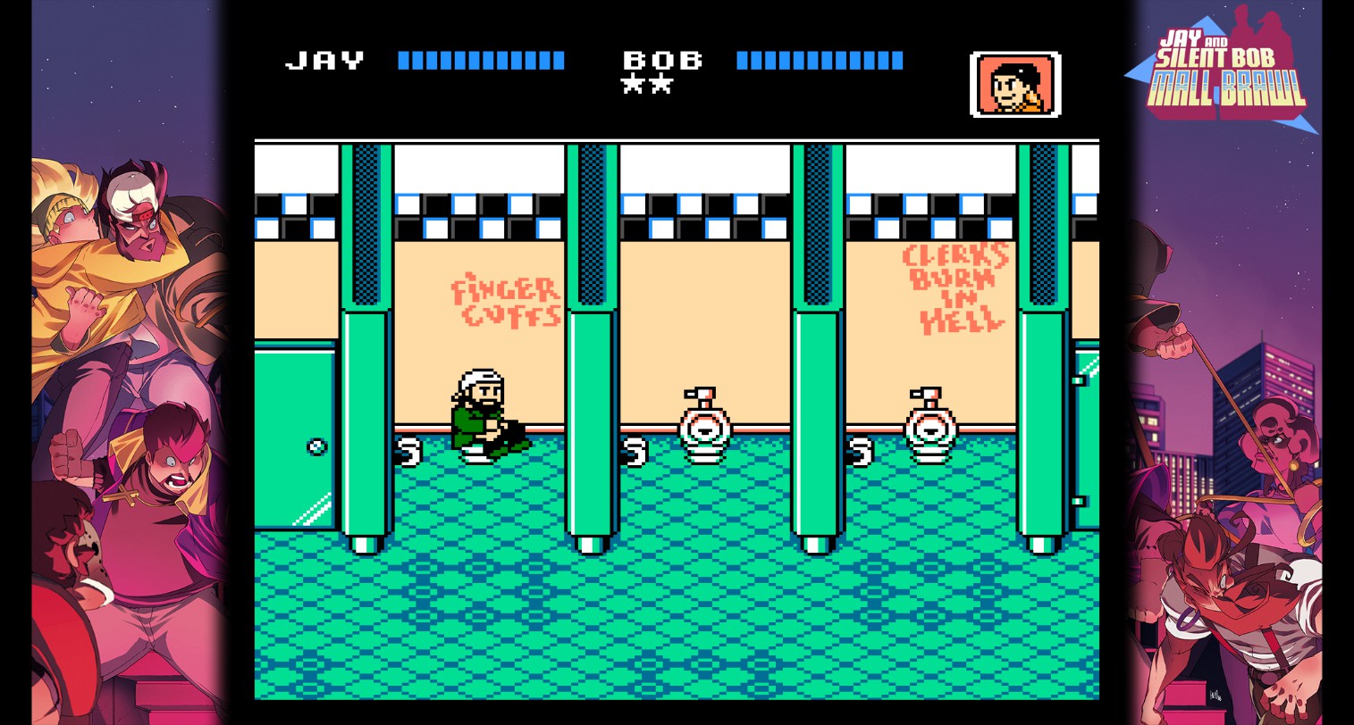 Play as Jay and Silent Bob in a retro 8-bit sidescrolling brawler solo or with a friend. Pummel enemies with hard-hitting combos, dash attacks, and elbow drops as well as a random assortment of weapons as you battle your way out of the mall and back to the Quickstop.
