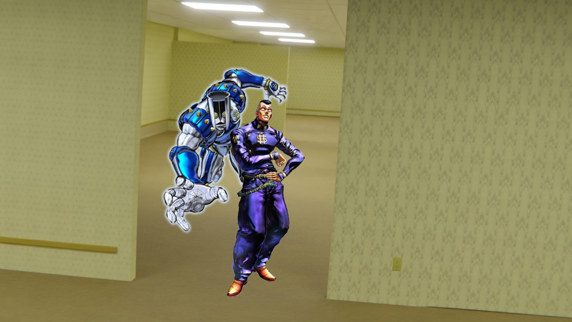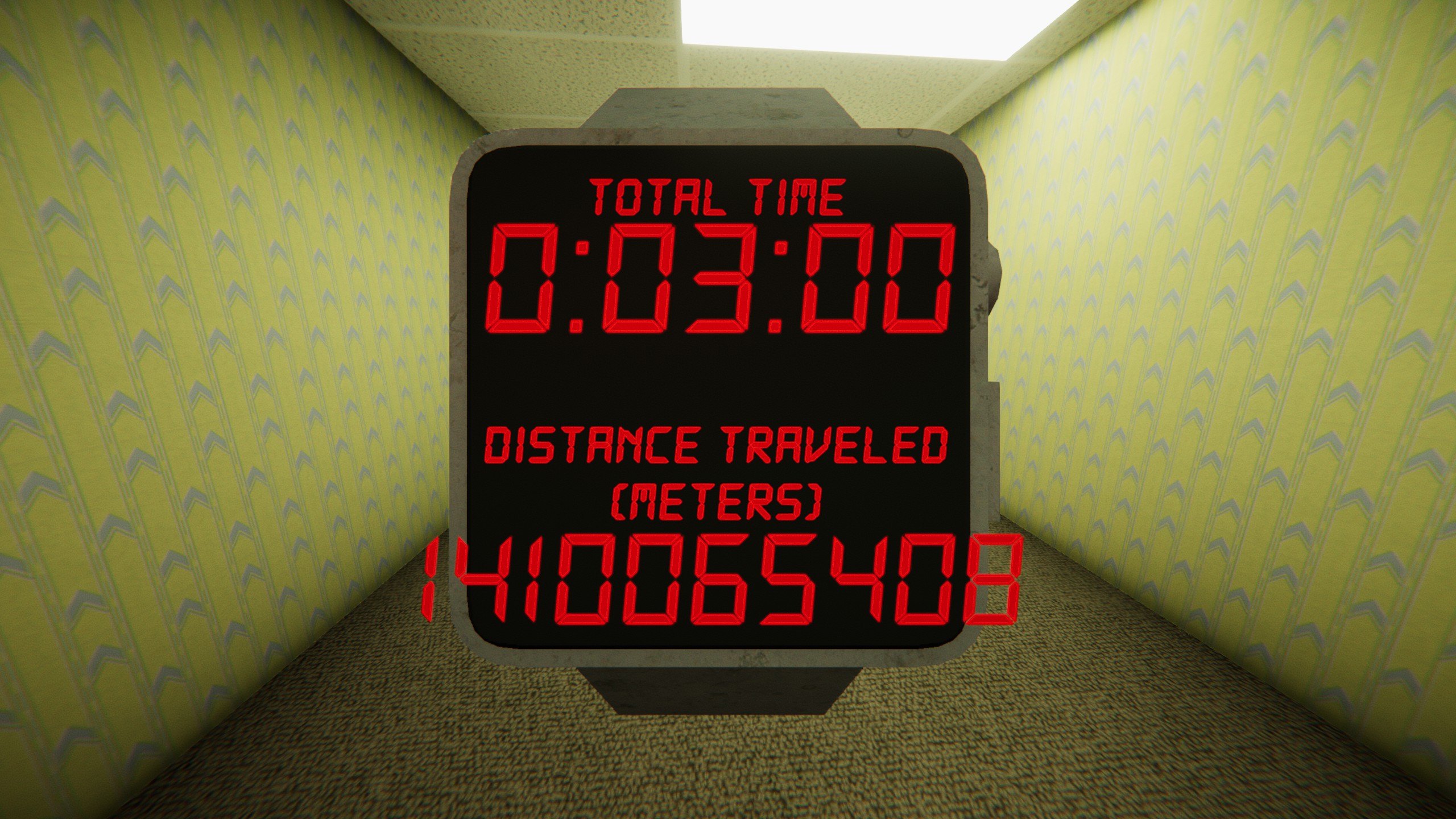 Nothing but the stink of old, moist carpets, the madness of mono-yellow, and the blinding light of fluorescent bulbs at maximum hum-buzz. Over 600 million sq. miles of randomly segmented rooms. God save you if you hear something wandering nearby, because it sure as hell has heard you.