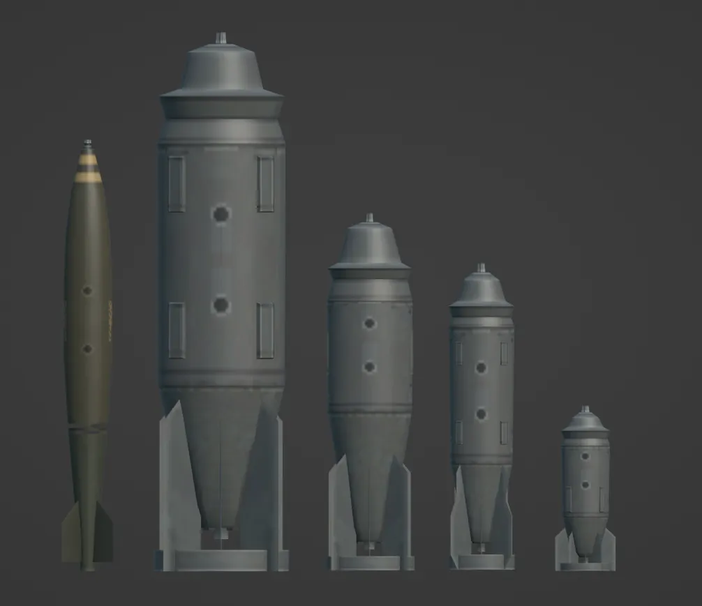 New series of heavy weight USSR bombs (FAB-9000, FAB-3000, FAB-1500, and FAB-500), compared to US Mark 84 2000 lb bomb (at left).