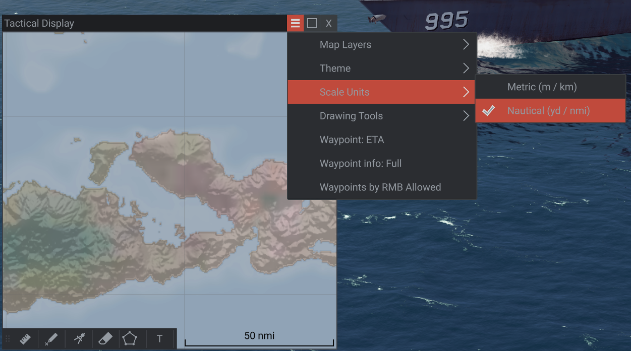 Shown: new menu option to change the map Scale Units, allowing selection of metric vs nautical units.