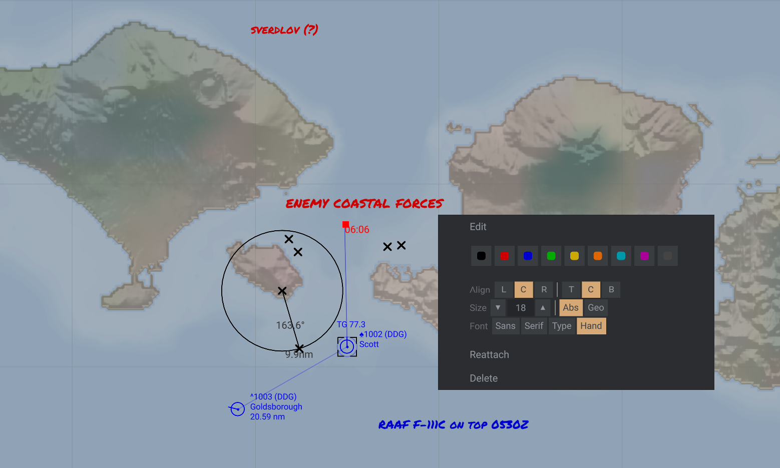 Shown: map labeling controls, with colors, alignment, sizing, and fonts available, and the ability to attach labels to contacts.