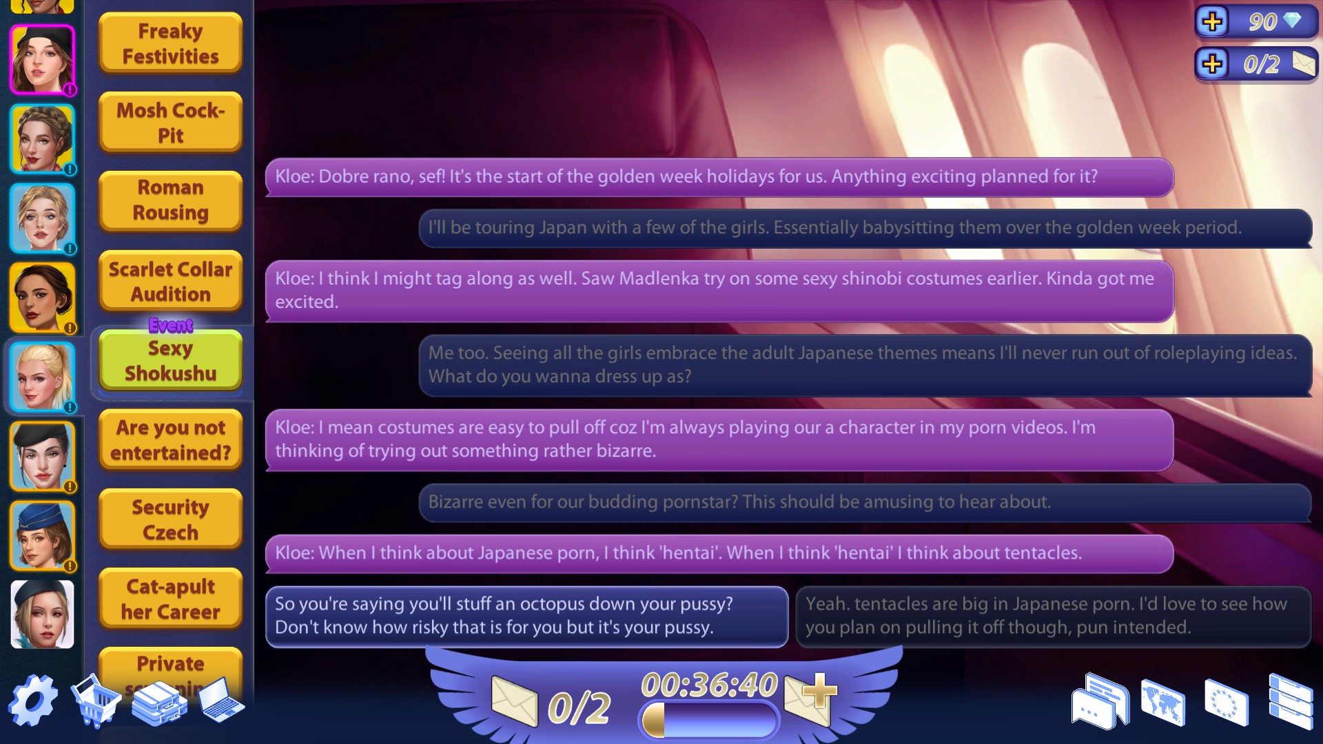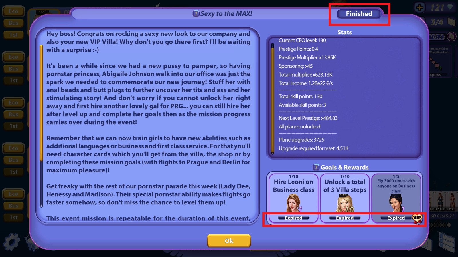 Sexy Airlines is an idle-clicker dating game, that puts you in charge of an airlines company. Your goal is to use your business to hire flight attendants and get intimate with them. The more successful your business, the greater your ability to progress with the girls and make them fall for you.