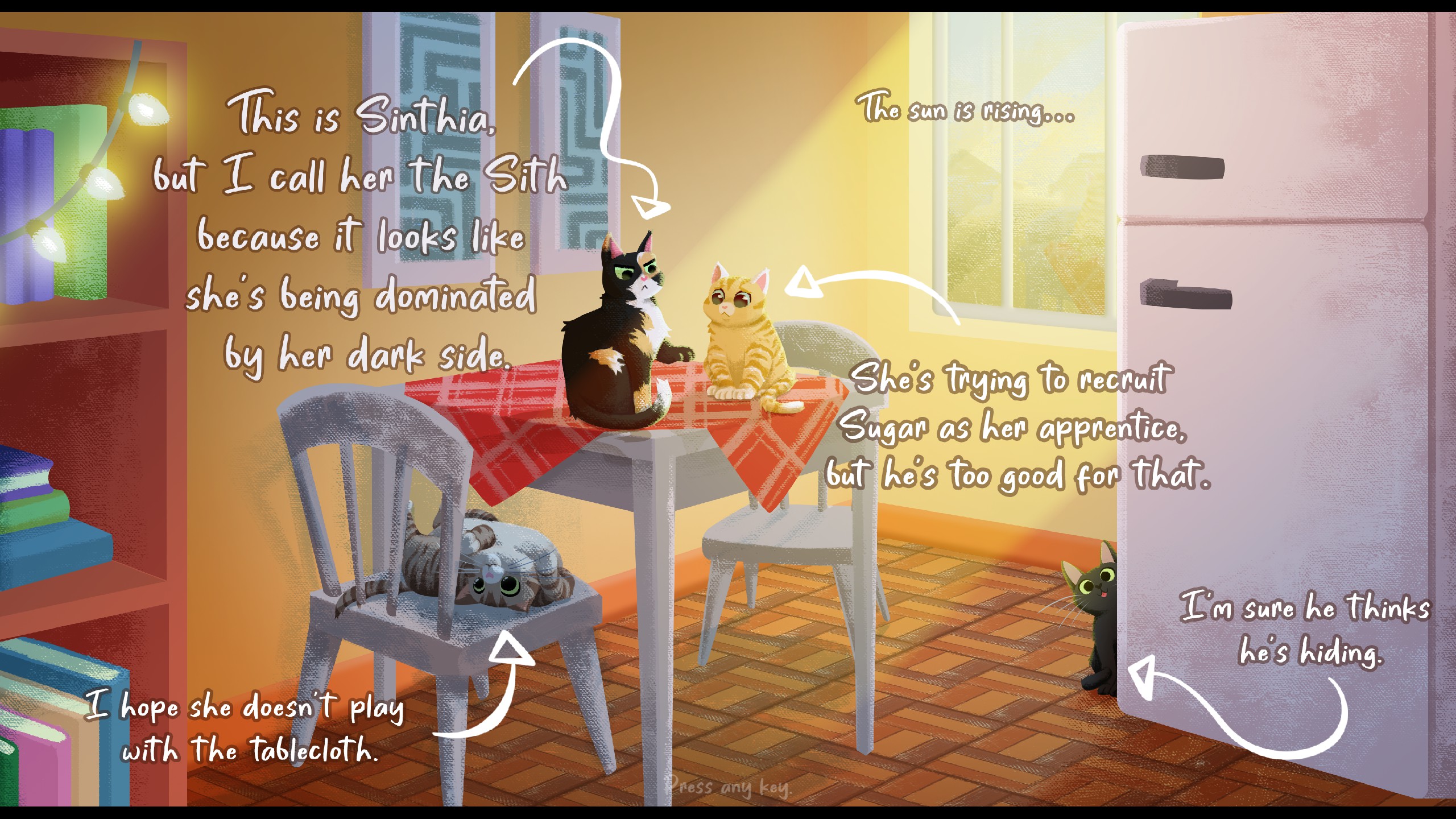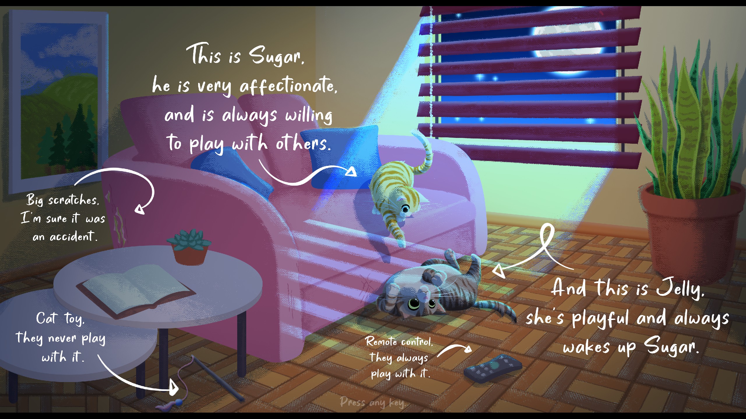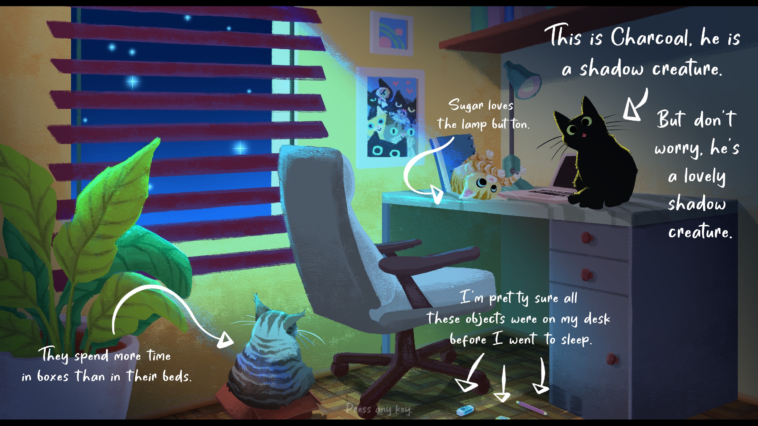 Did you ever wake up in the middle of the night because you heard the cat meowing? This game is just about that! Meet a family with five naughty cats and solve puzzles while trying to convince them to sleep.