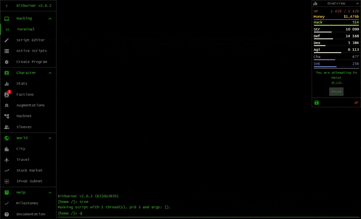 Bitburner is a programming-based incremental game. Write scripts in JavaScript to automate gameplay, learn skills, play minigames, solve puzzles, and more in this cyberpunk text-based incremental RPG.