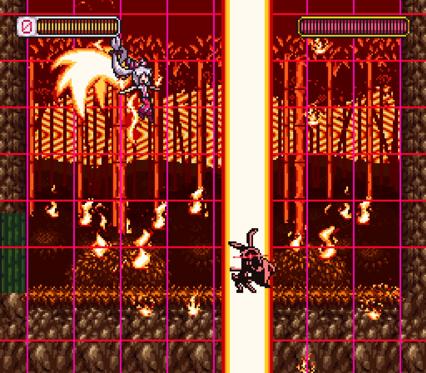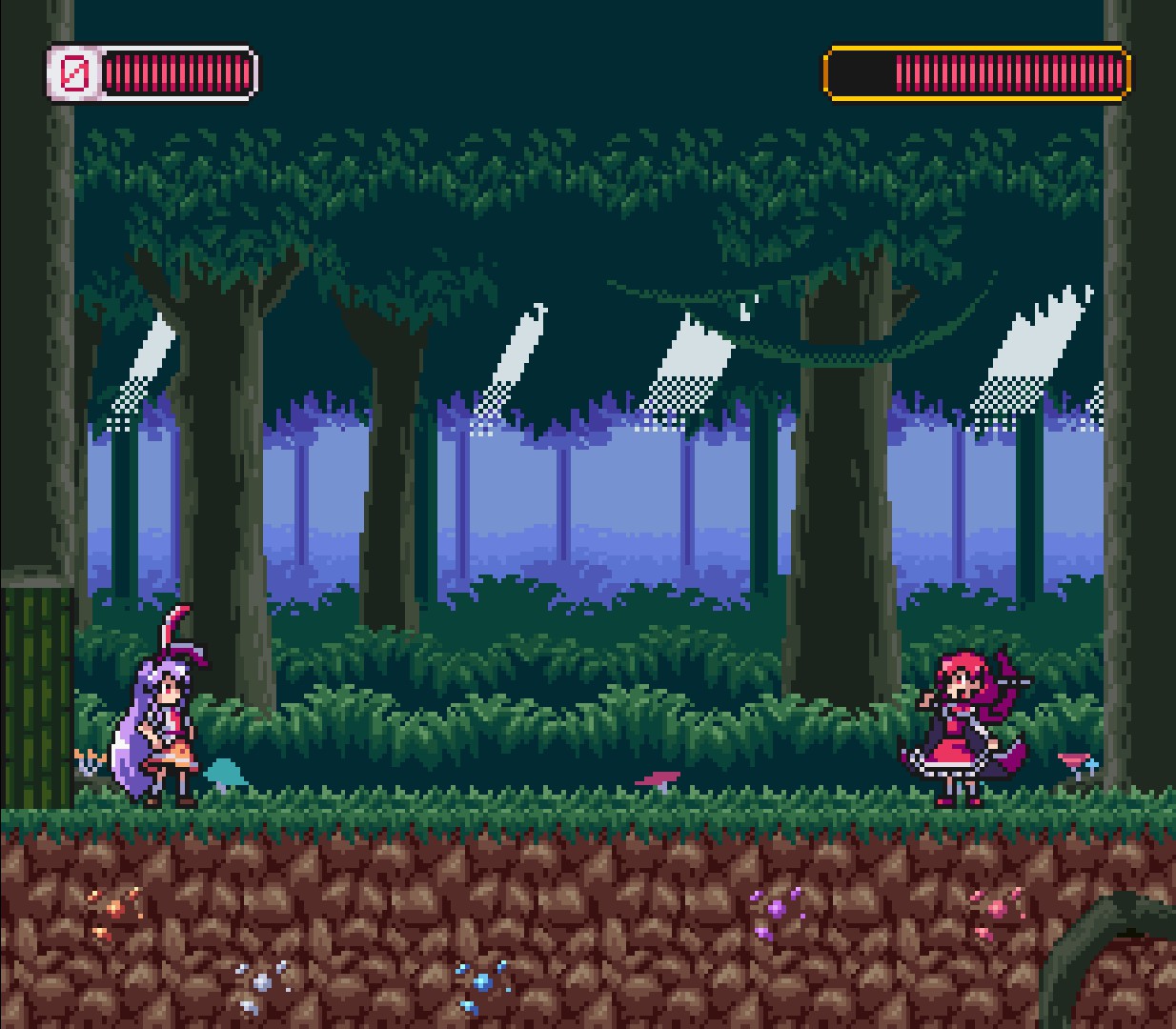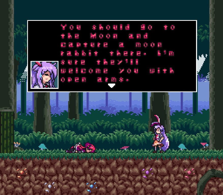月兔又迫降,铃仙救助忙。 闯过十四关,除暴再安良。 本作是基于东方project的二次创作2D横版平台弹幕游戏。
