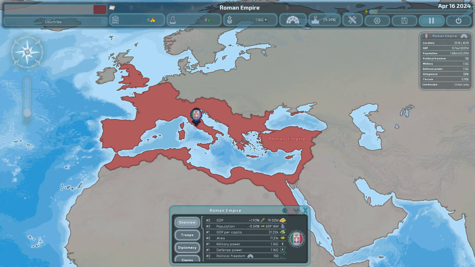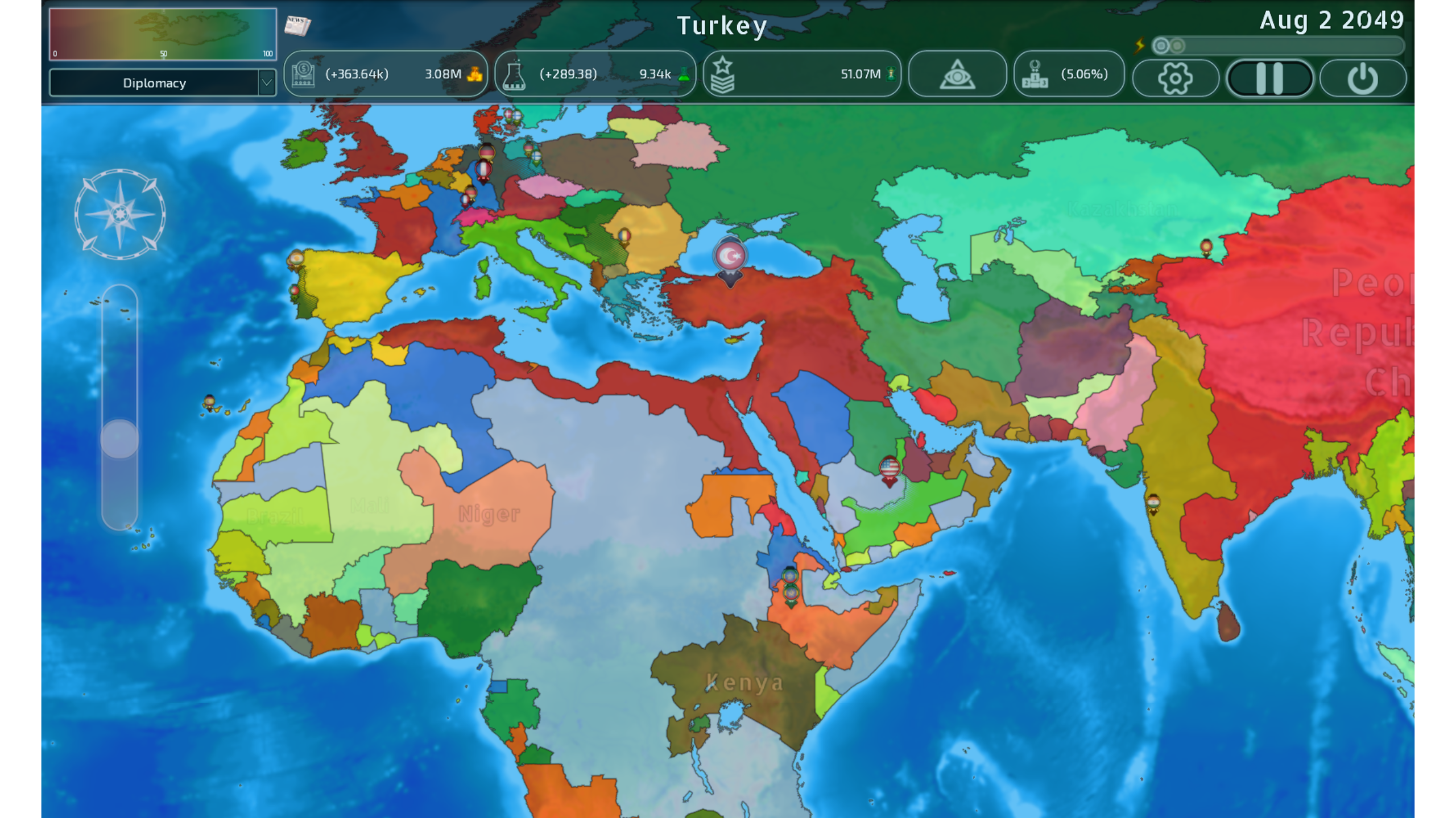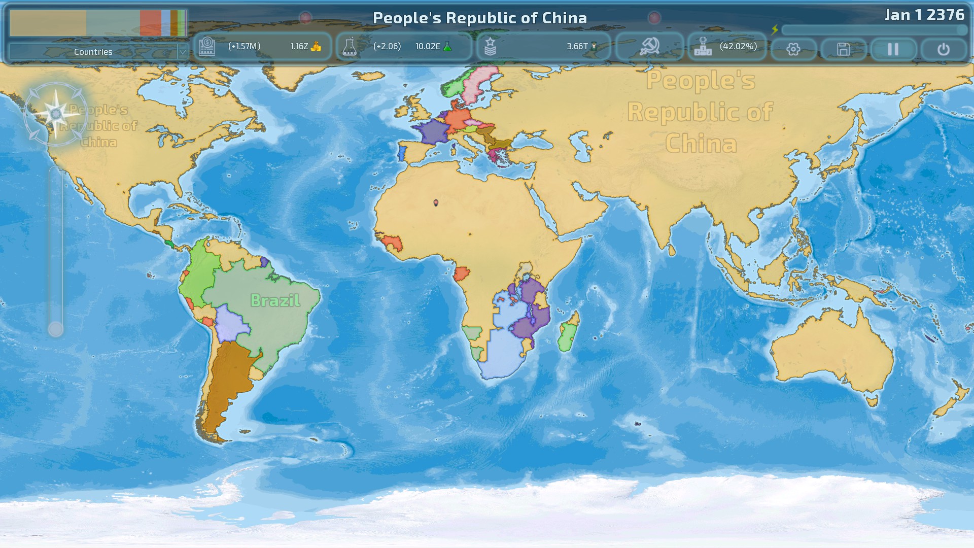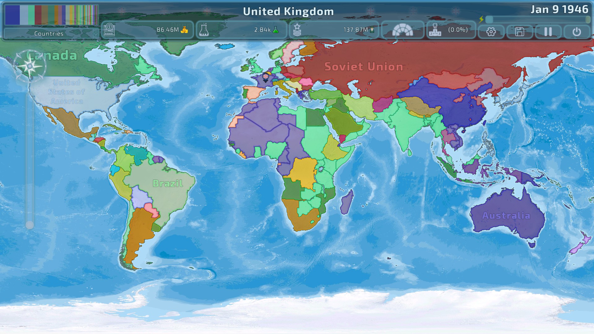 地缘政治管理游戏,边界实时变化,敏捷的游戏体验,最大限度地减少了繁琐的环节,同时保持全面的战略控制,从军事招募和部署,到外交和经济管理。