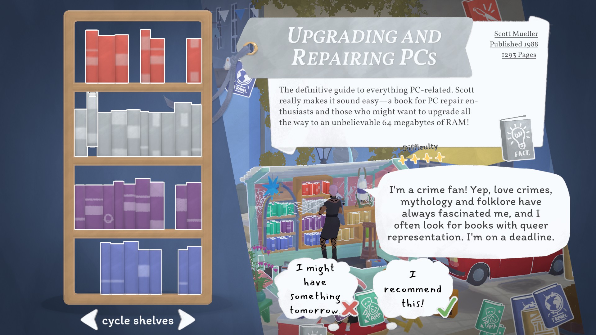 《小小书店》是一款以【书店经营 + 剧情互动 + 收集探索】为核心的治愈系模拟游戏。逃离朝九晚五,开着房车去海边卖书吧!在这款由真实图书数据驱动的经营游戏中,你需要进货、摆摊、根据当地人口味推荐书籍,全书目已进行深度中文本地化。装修你的移动书店,在慢生活中赚取第一桶金。