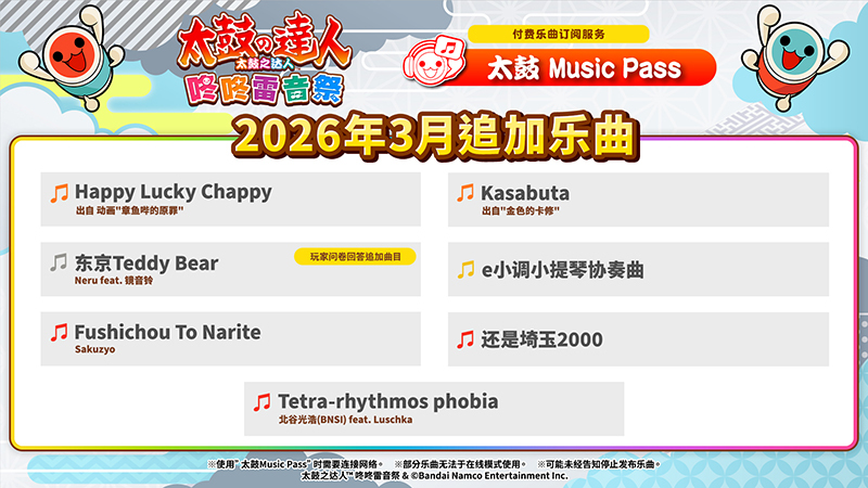 「太鼓之达人」是一款跟着乐曲节奏敲打和太鼓的多元节奏游戏。 游戏里收录了卡通动画音乐及VOCALOID™ Music等多首乐曲及各种游戏模式。