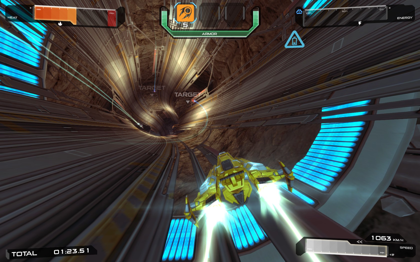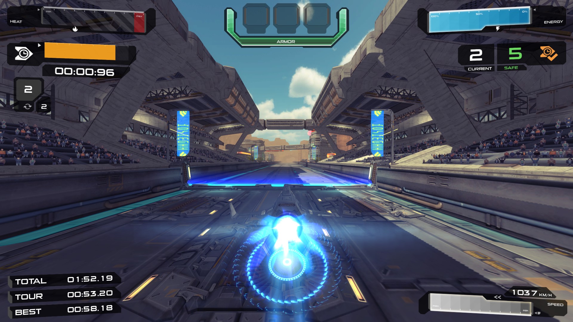 Be prepared for high-speed races against challenging AI pilots on huge, futuristic race tracks. Destroy your opponents with mounted cannons and special pick-up weapons, upgrade and fly different racers in a vast and spectacular environment on earth and in space.