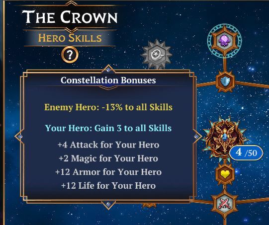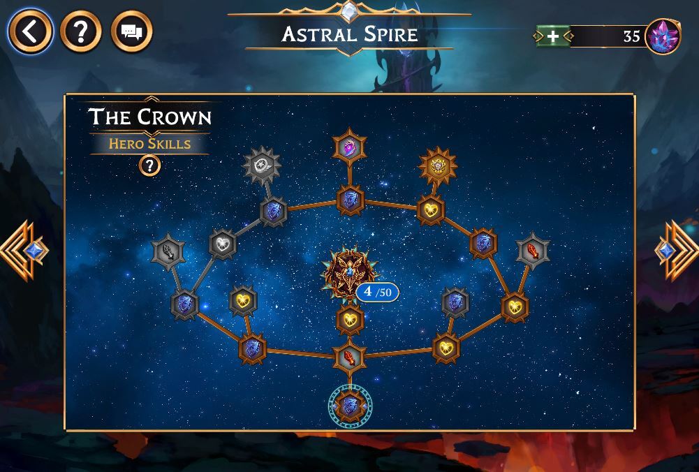 Above is one of our first Astra Spire constellations, “The Crown,” which focuses on Hero skills. You can see the backgrounds of the unlocked nodes, match their tier – Bronze, Silver and Gold.