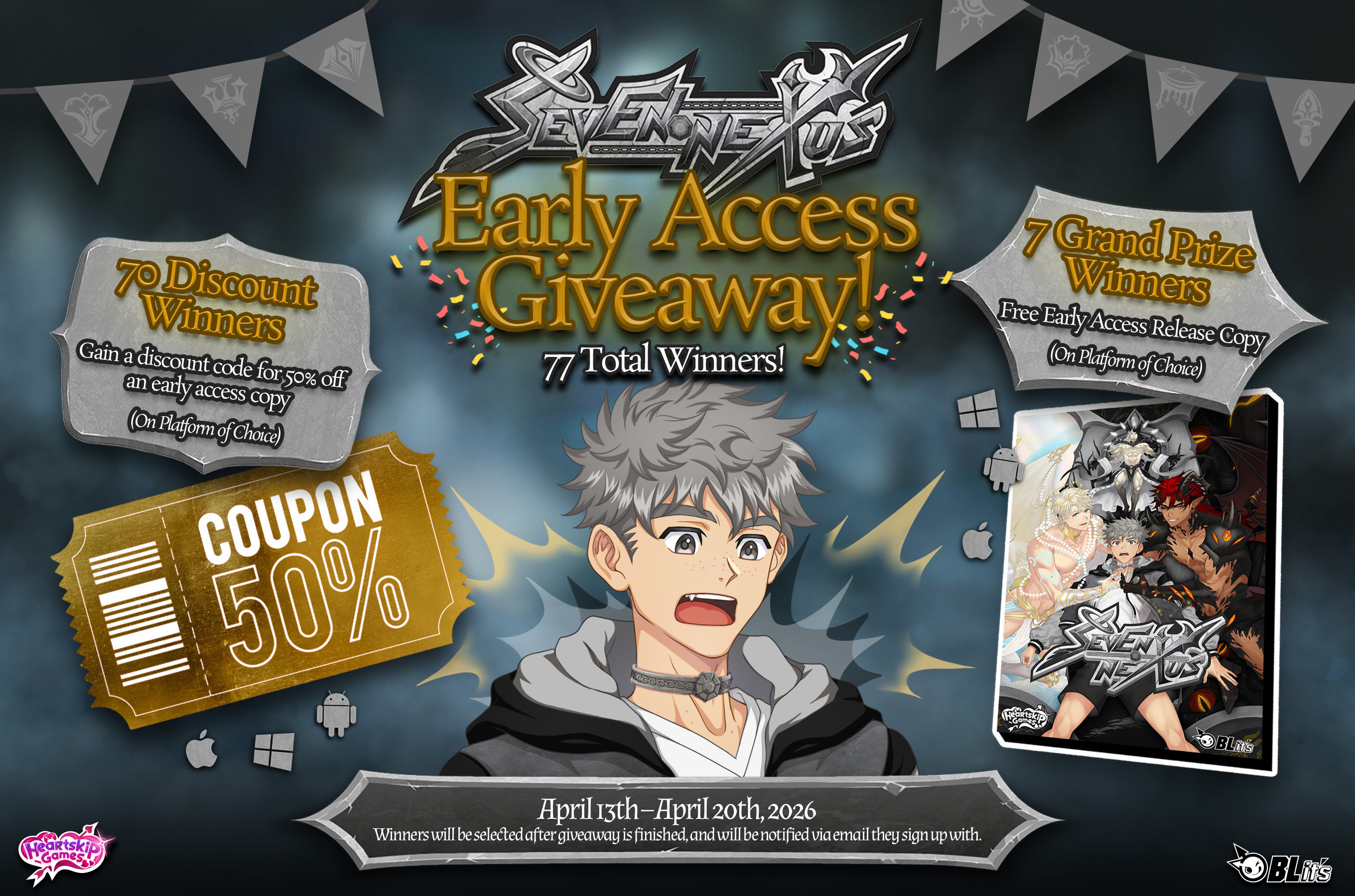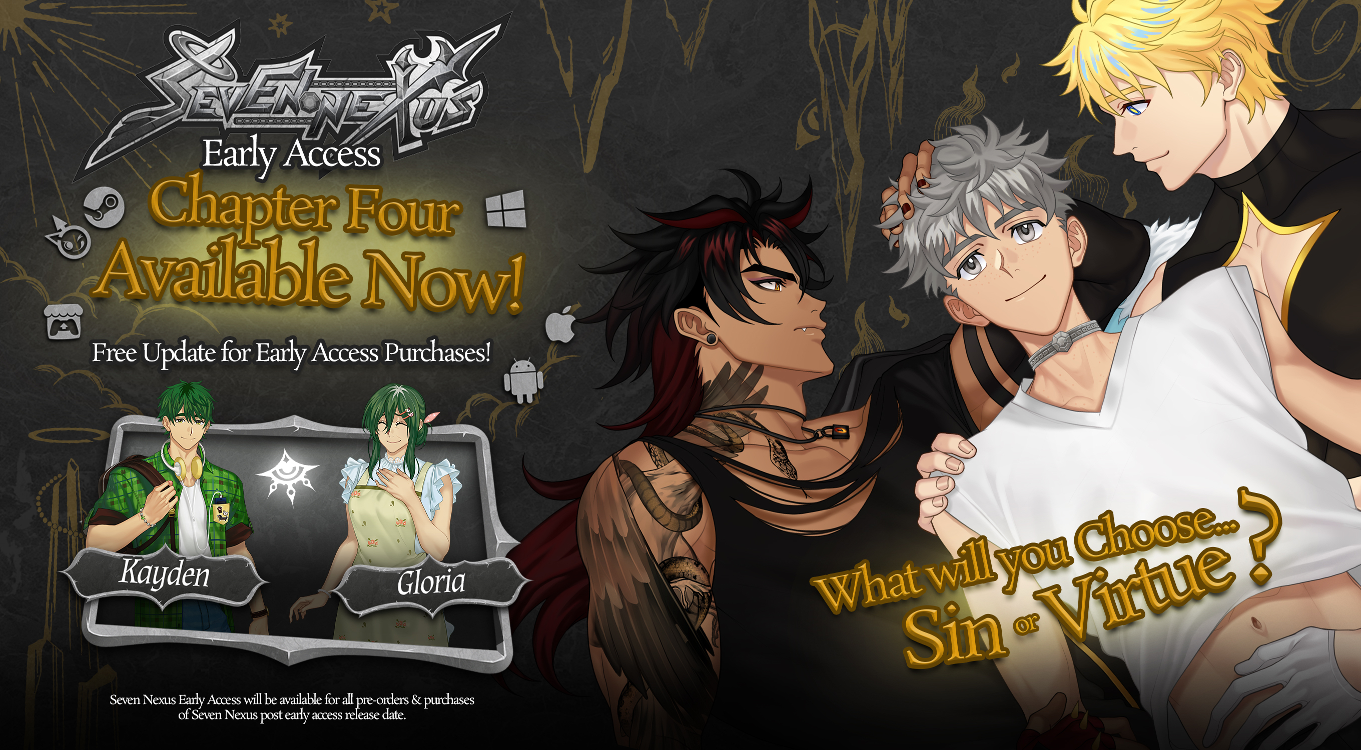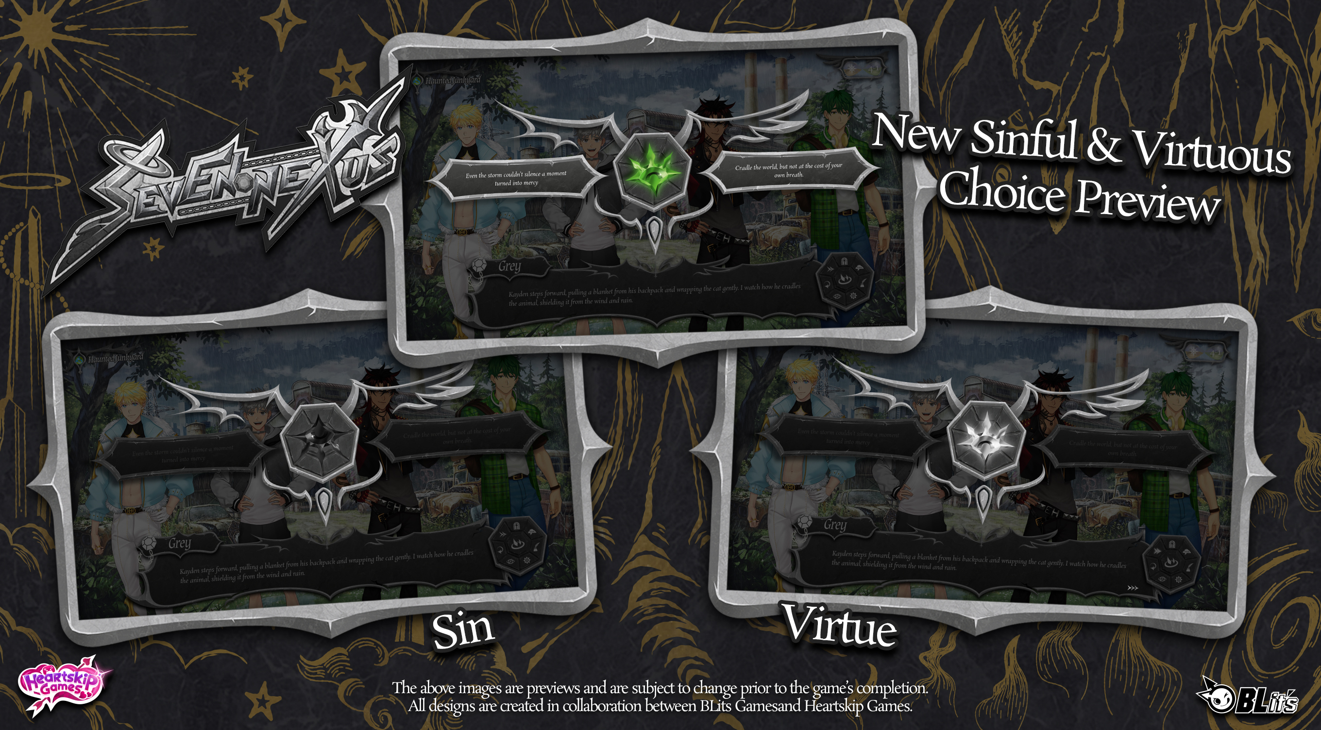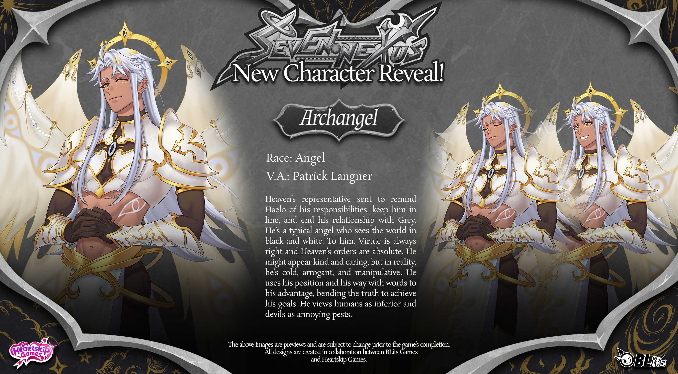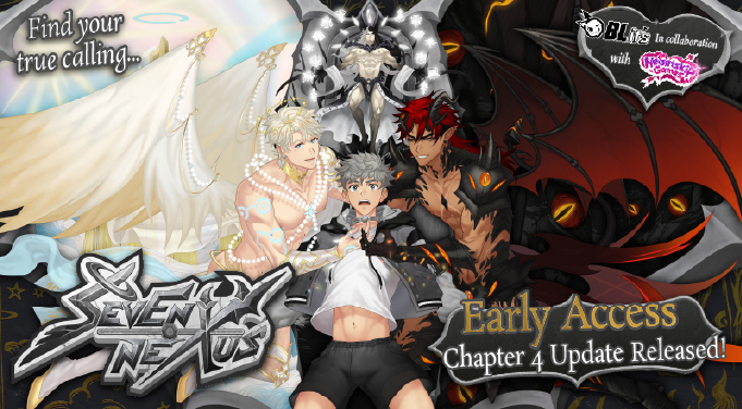 Seven Nexus is an Adult BL/Gay Visual Novel about Grey, a man who dies but can’t go to Heaven or Hell. He must complete the Seven Trials on Earth, accompanied by two Guardians: an angel and a devil. Each choice draws Grey toward virtue or sin… and into deeper intimacy with his Guardians.