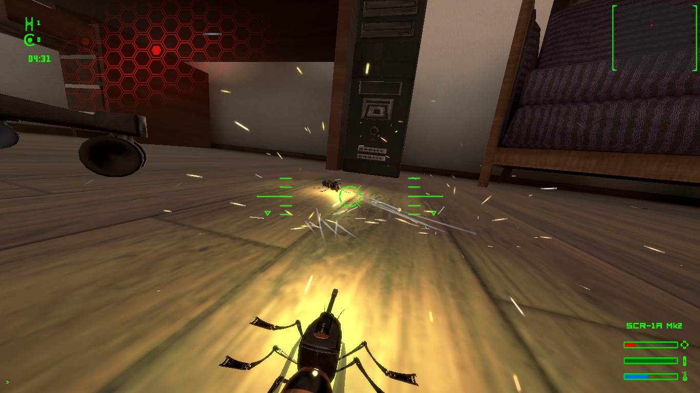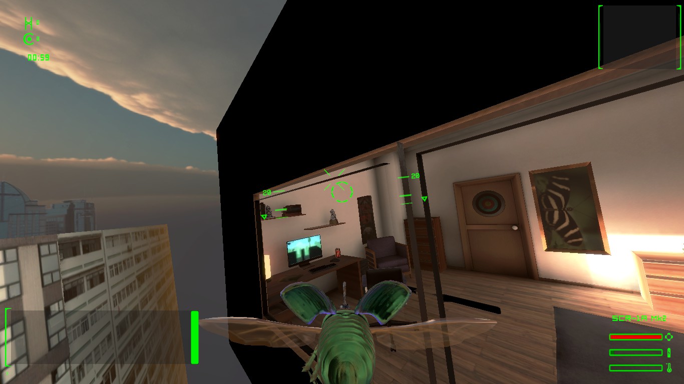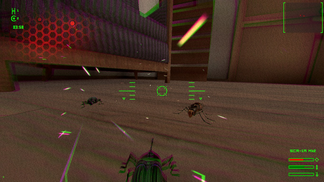 Spy_Bugs is a flying game in which the protagonists are cyborg insects upgraded with high tech weapons. They can fly, land, fire weapons and make special attacks, each insect is a different character with a specific weapon, special attack and specific role.