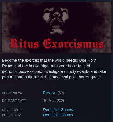 Become the exorcist that the world needs! Use Holy Relics and the knowledge from your book to fight demonic possessions. Investigate unholy events and take part in church rituals in this medieval pixel horror game.
