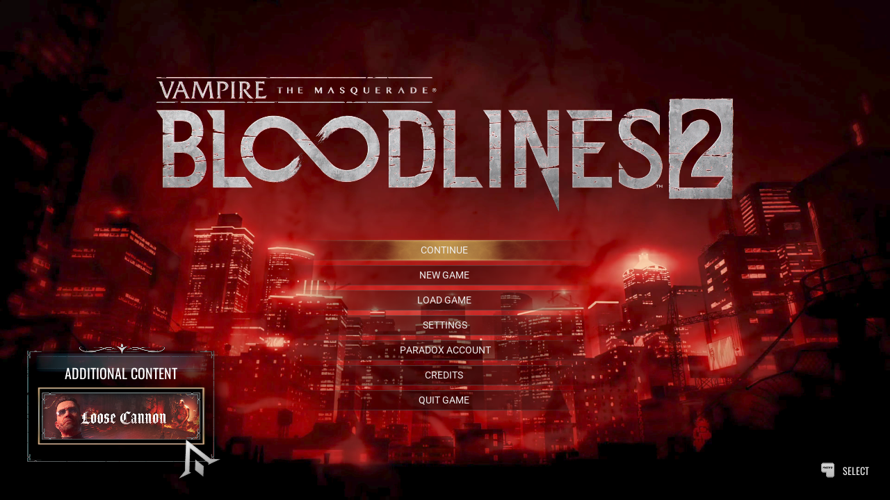 Description: Screenshot of the main menu, featuring a button to launch the Loose Cannon DLC.