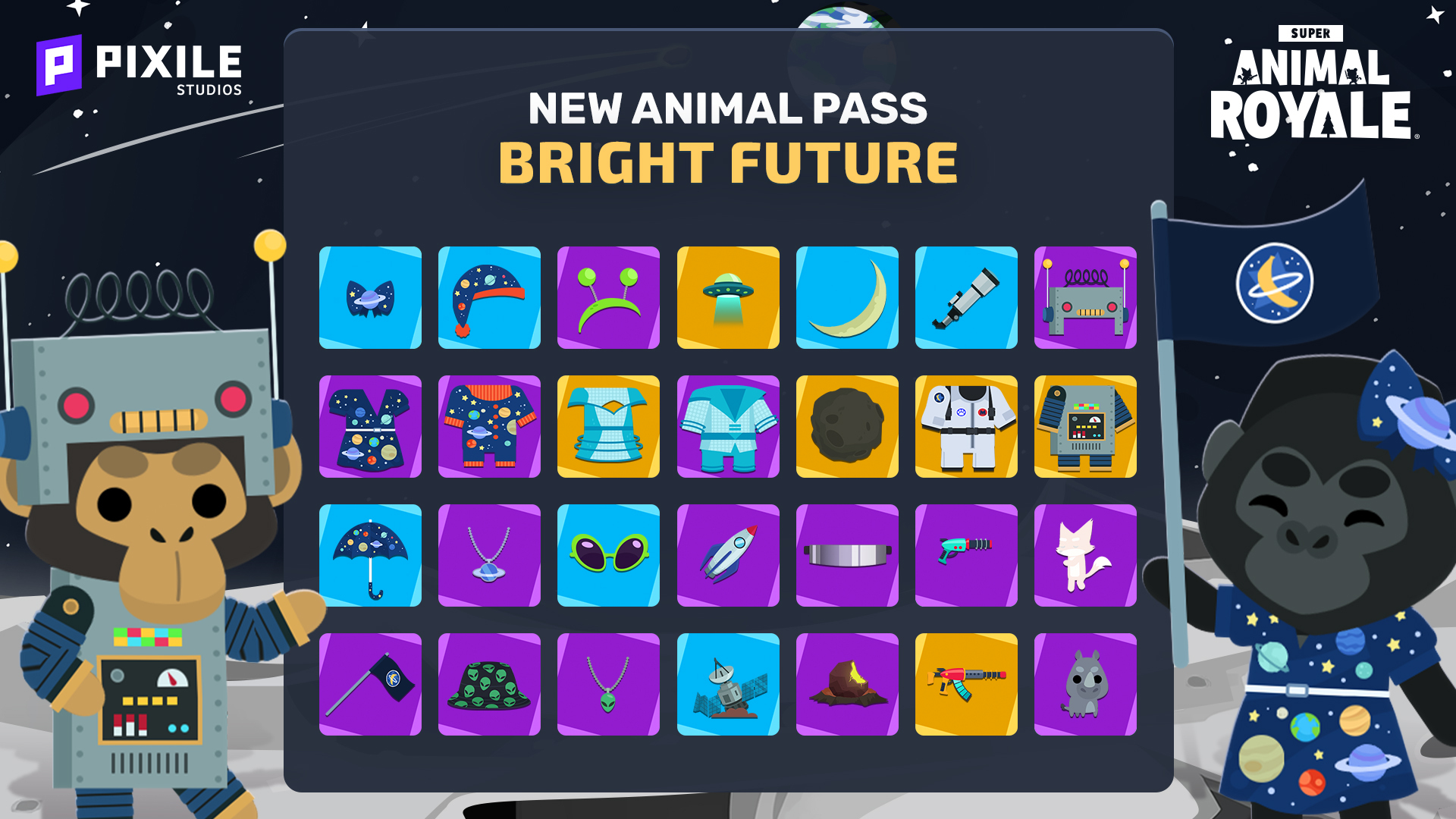 The Bright Future Pass celebrates the meteor’s arrival while bringing the update’s retro-future sci-fi theme to life, with the Mini Rhino, Moonwalk emote, and loads of cosmetics inspired by classic sci-fi.