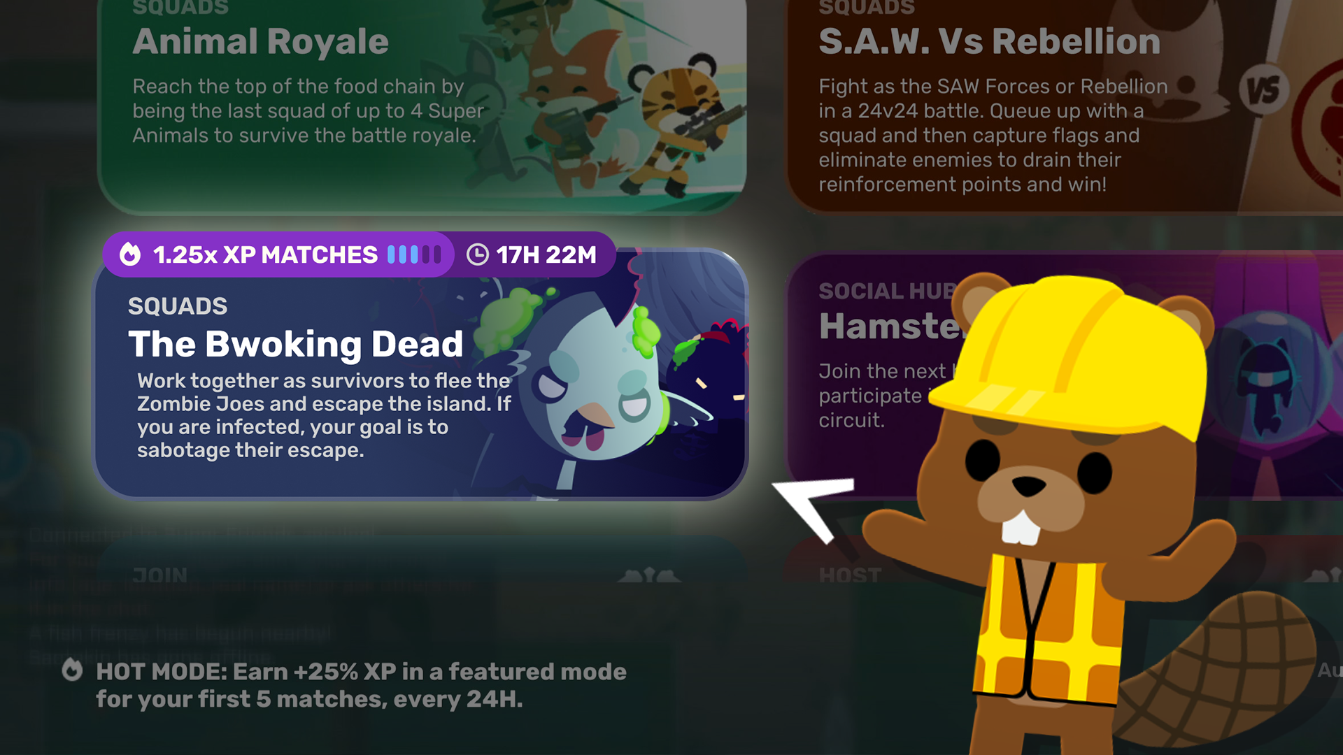 Hot Mode is here! Every 24 hours, one game mode will be marked as the day’s Hot Mode. For the first 5 matches you play in that mode, you’ll get an extra 25% XP! And don’t worry too much if you get eliminated early; you’ll always get a minimum 100 XP from completing a Hot Mode match.