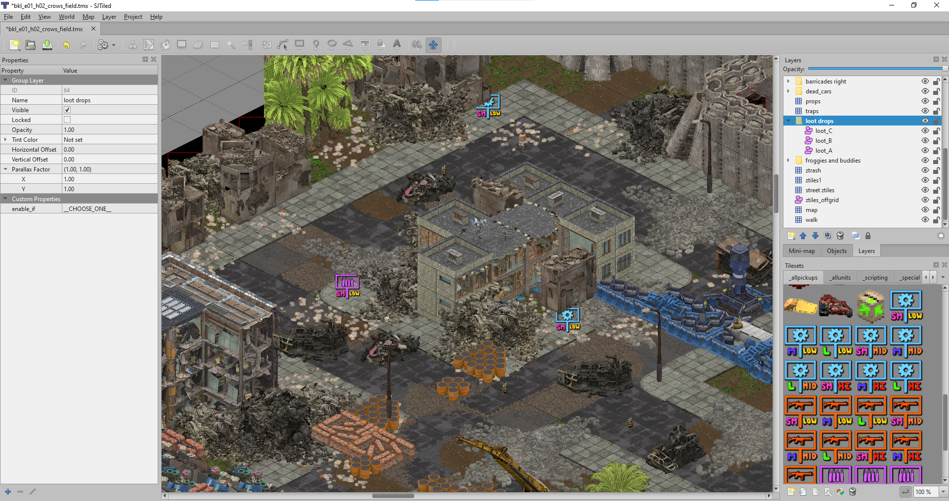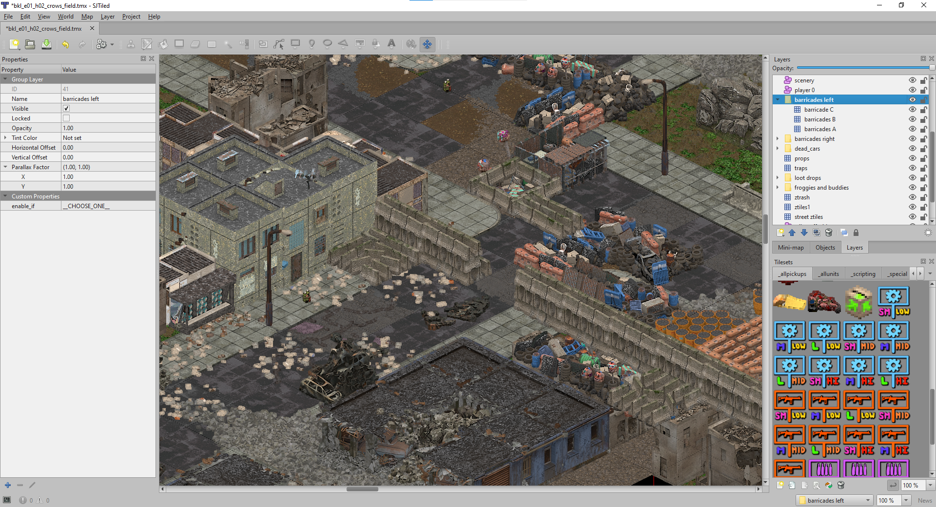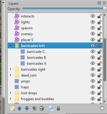 Seen in this image are both the concrete barriers and the junk barricades, but in-game they are not visible at the same time. The reason is because of a third type of layer, called a group layer. Functionally, a group layer is like a folder that you can put other layers into (even another group layer if you like). Looking at the layer list a little more closely…