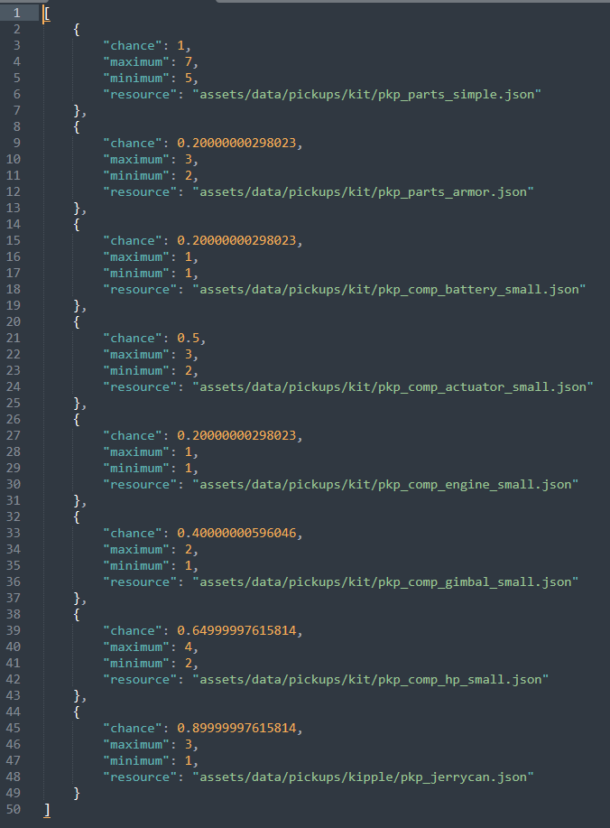 Now remember: the positions of these three boxes are static in the Tiled editor. In addition, they all have the same inventory .json file attached to them, so how can one box produce different results? The answer is by opening up the inventory .json file, and taking a look. This specific inventory file is called salvagechest_parts_t0_sm_01.json, and this is what's inside.