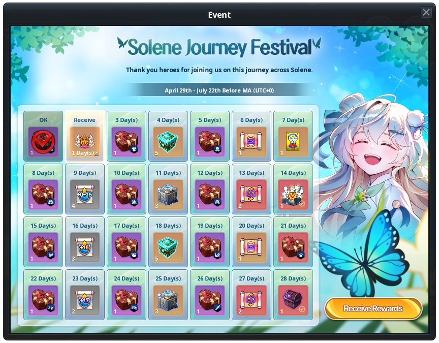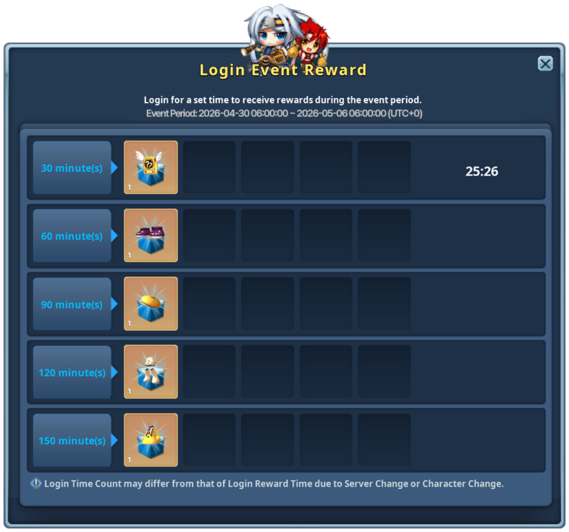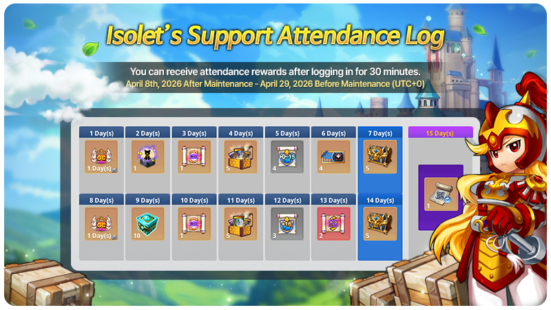 - For 15 days, players can log in to the game for 30 minutes to receive a daily Login Reward.