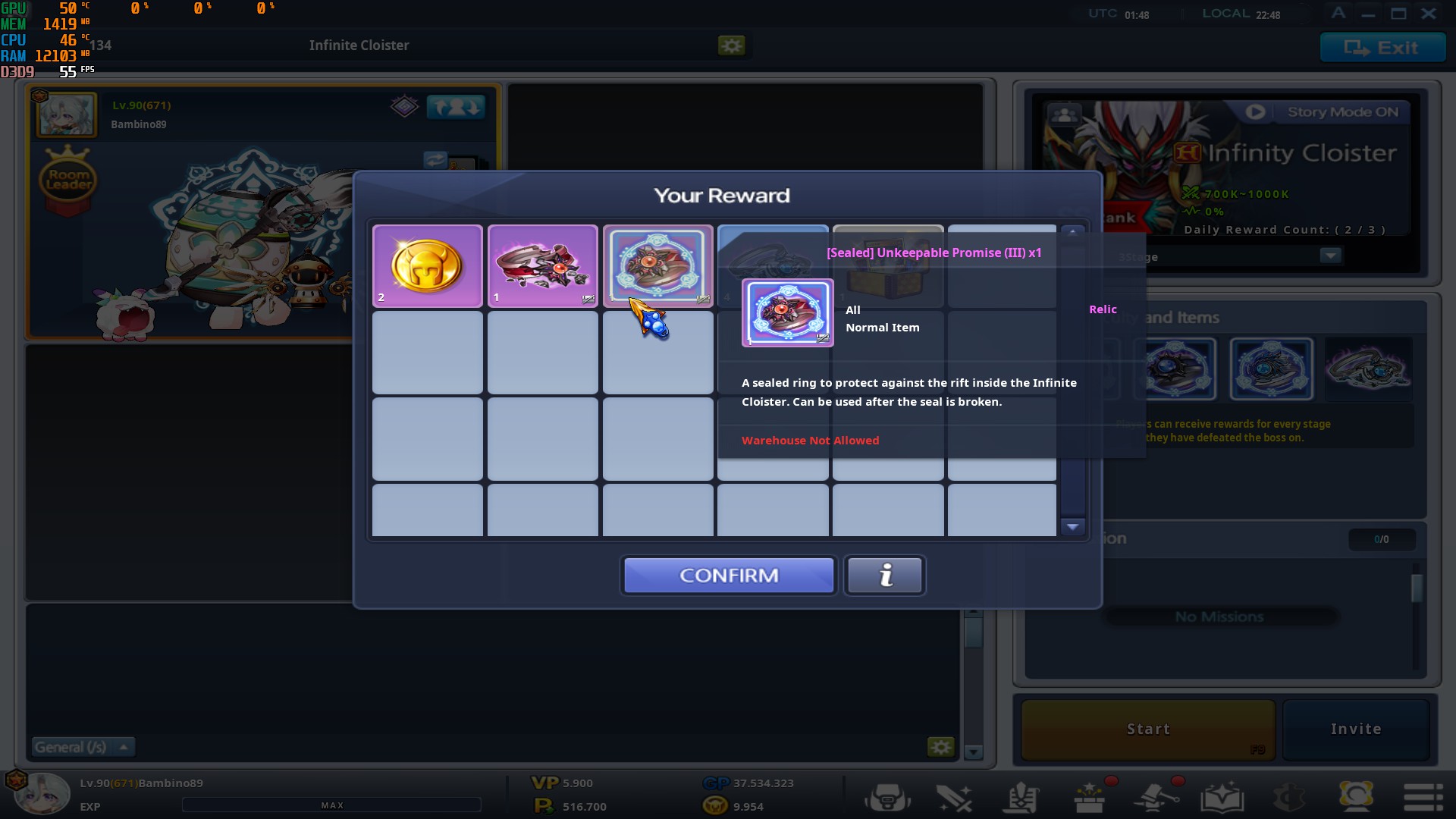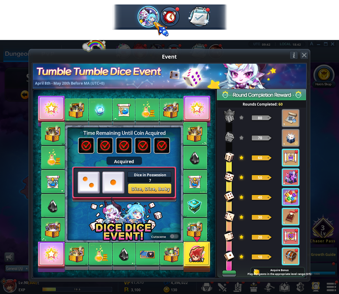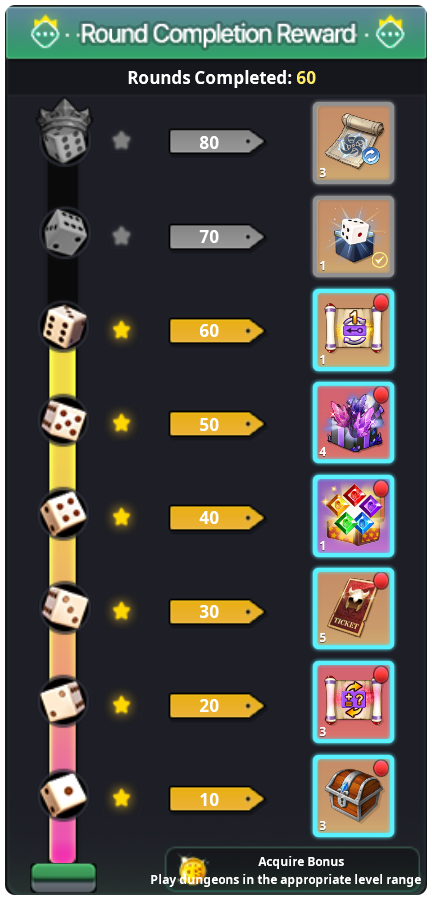 - For each round completion of the Dice Game Board, players will receive a [[Event] 1 Round Completion Box] in the Inventory.