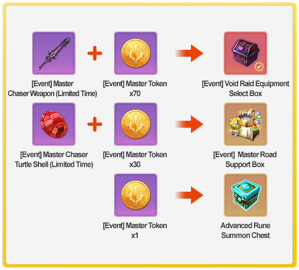 - [Event] Master Chaser Equipment can be exchanged for useful items at [Refinery] → [Crafting] → [Event] tab before the event ends.