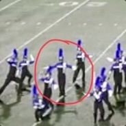 a very low definition screenshot of me doing a t pose during a marching band field tournament