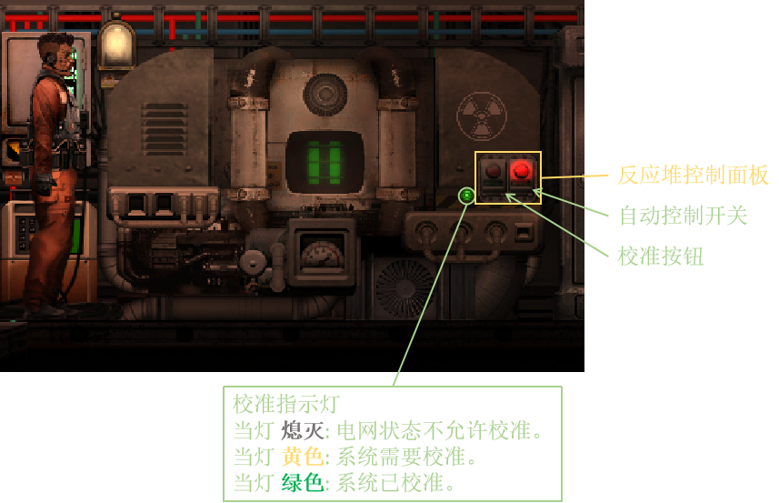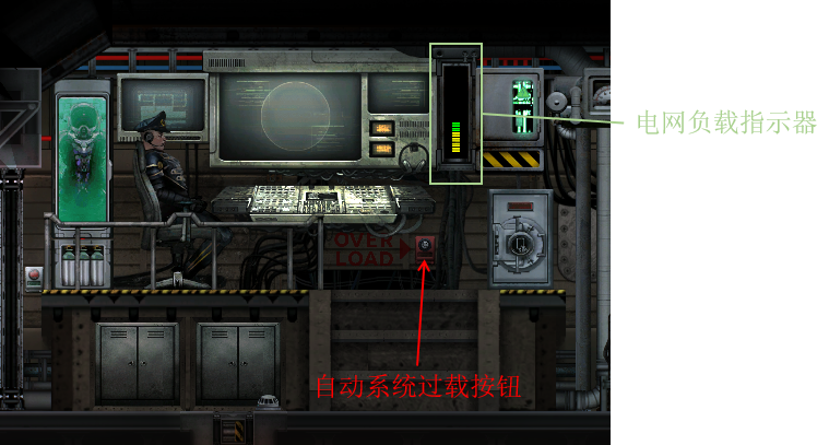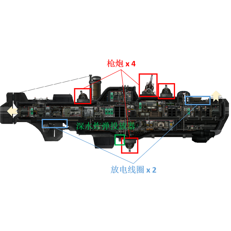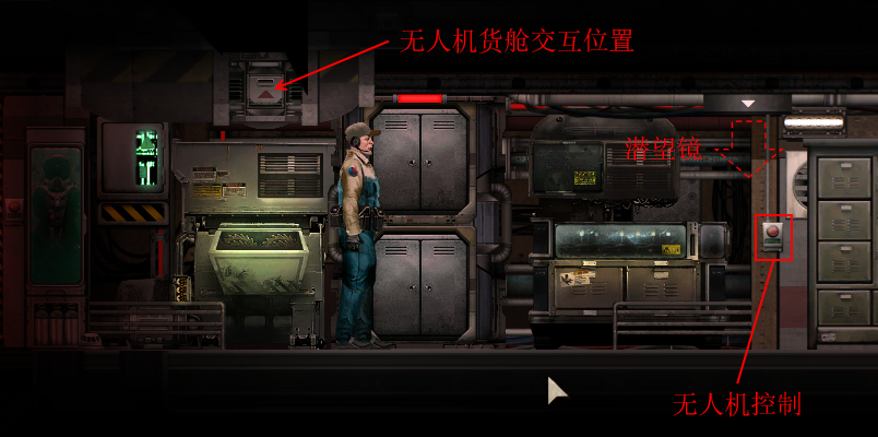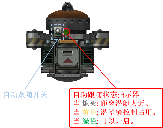 另一种无人机控制模式是自动跟随模式。自动跟随模式下无人机可以自动跟随周围的人类而不需要任何额外的人为操作。当检测范围内存在多名潜水员时,无人机将尝试保持在所有人的“中央”位置。为避免舱内人员干扰无人机的控制,自动跟随模式只能在距离潜艇中央位置26,米以上时开启。一个指示灯会告知你当前自动跟随系统的状态:当指示灯熄灭时,无人机距离潜艇太近无法开启自动控制;当指示灯为黄色时,自动跟随模式可以开启,但是当前仍处于潜望镜控制模式;当指示灯为绿色时,自动跟随模式可以开启。你可以通过点击无人机控制面板左侧的按钮来手动开启或关闭无人机的自动控制模式,从而在必要的时候命令无人机跟随或保持原地(每次无人机停泊以后,自动跟随模式都将关闭)。